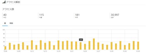 12月後半のブログ報告です。 16日42、17日22、18日46、19日42、20日45、21日41、22日41、23日37、24日29、25日43、26日56、27日36、28日29、29日24、30日38、31日31、というアクセス数です。 20割れの日もなく、100近くアクセスが入る日もありません。通常運…