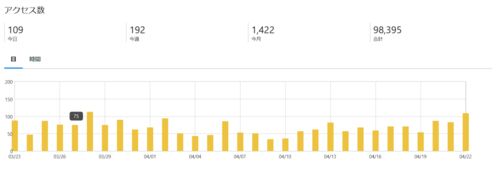 ブログのアクセスとそれに関連したブログの状況の報告記事を書いていきます。今回は、4月前半のアクセス数とブログの状況です。 4月1日68、2日94、3日51、4日43、5日46、6日86、7日53、8日51、9日34、10日36、11日57、12日62、13日82、14日57、15日68という…